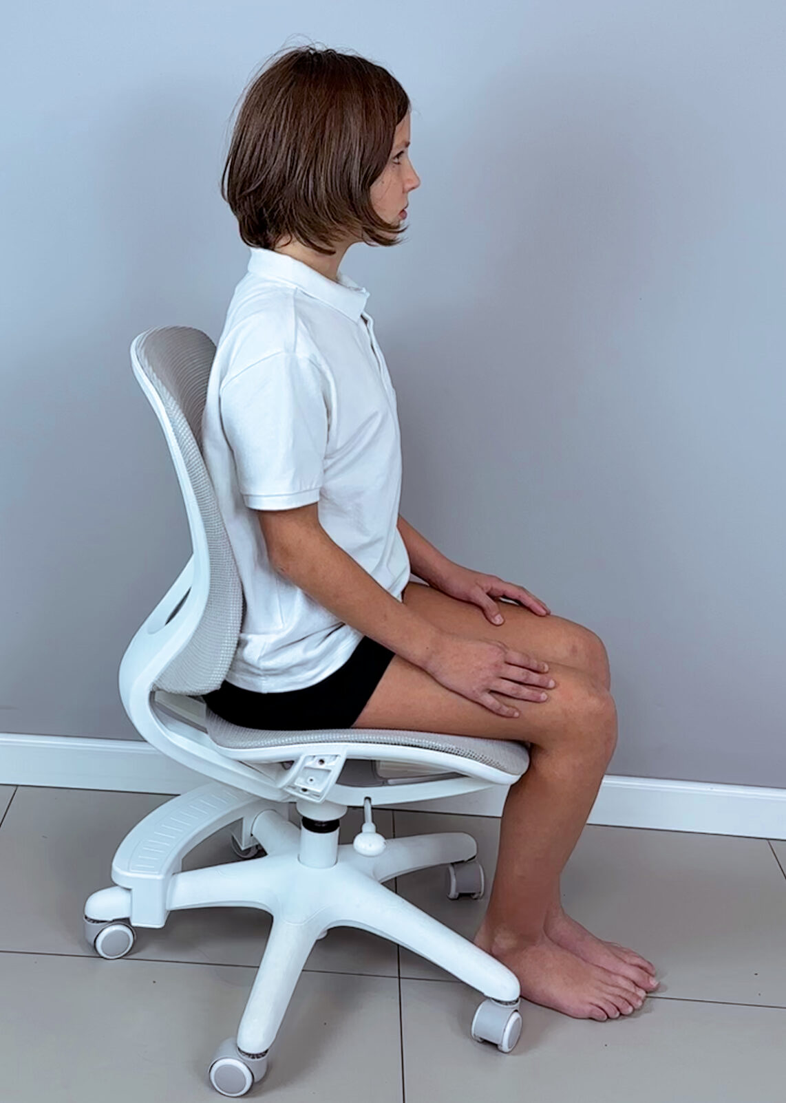 - Dziecko siedzi wygodnie; stopy swobodnie oparte o podłogę (kąt 90°).